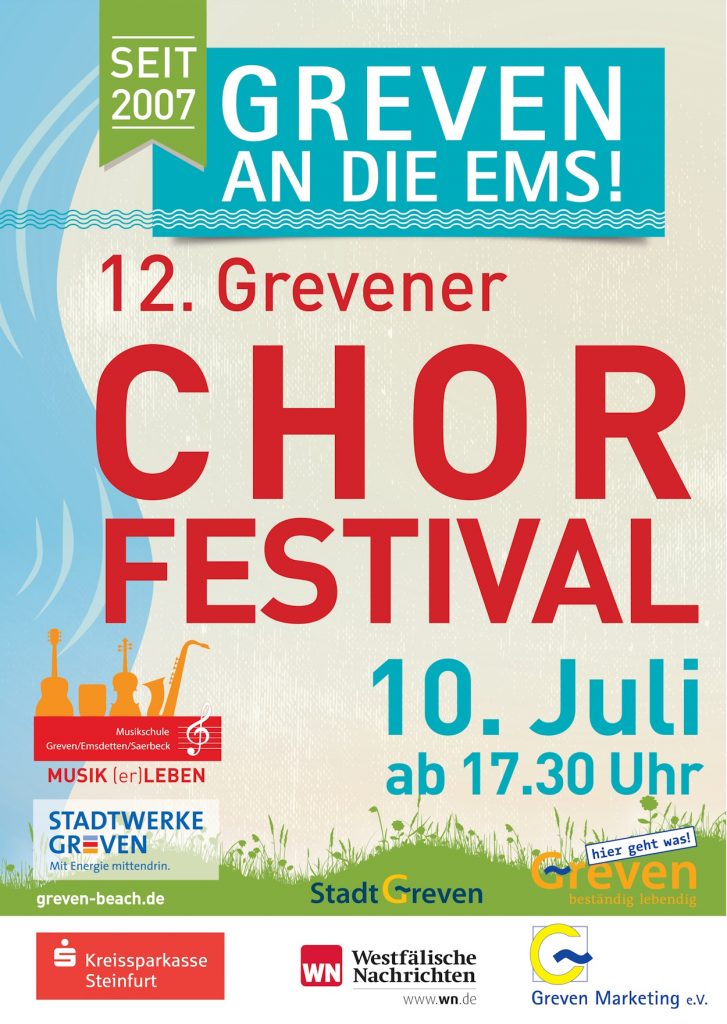 Das beliebte Chorevent findet am Freitag, 10. Juli 2026 von 17:30 bis 22:00 am Emsbeach in Greven statt. Die Uhrzeit unseres Auftritts geben wir hier rechtzeitig vorher bekannt.